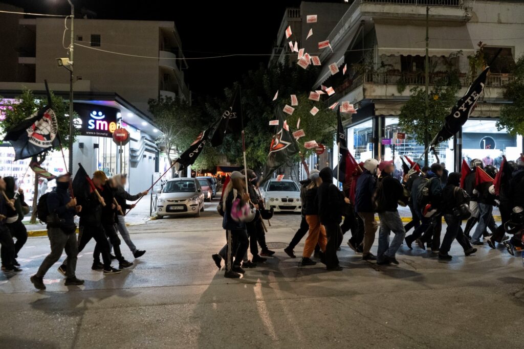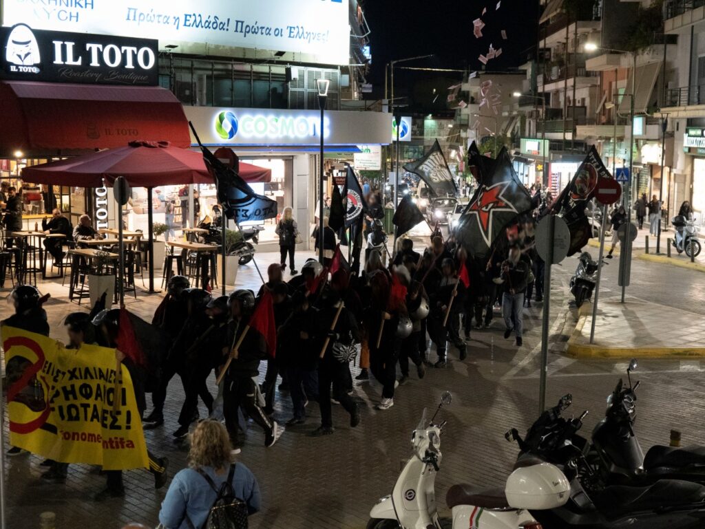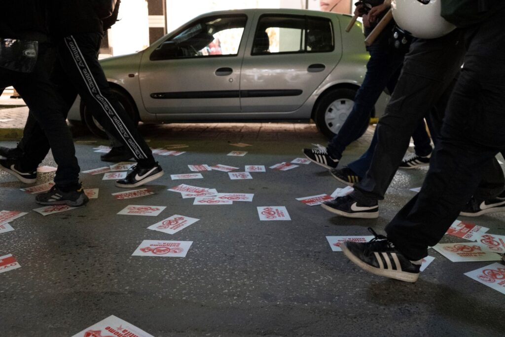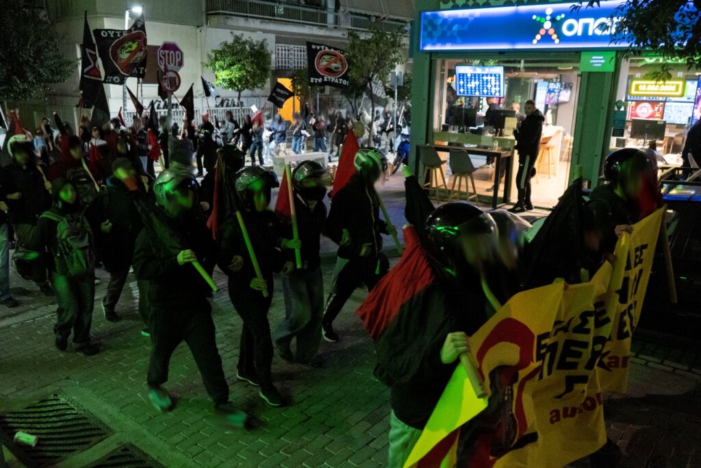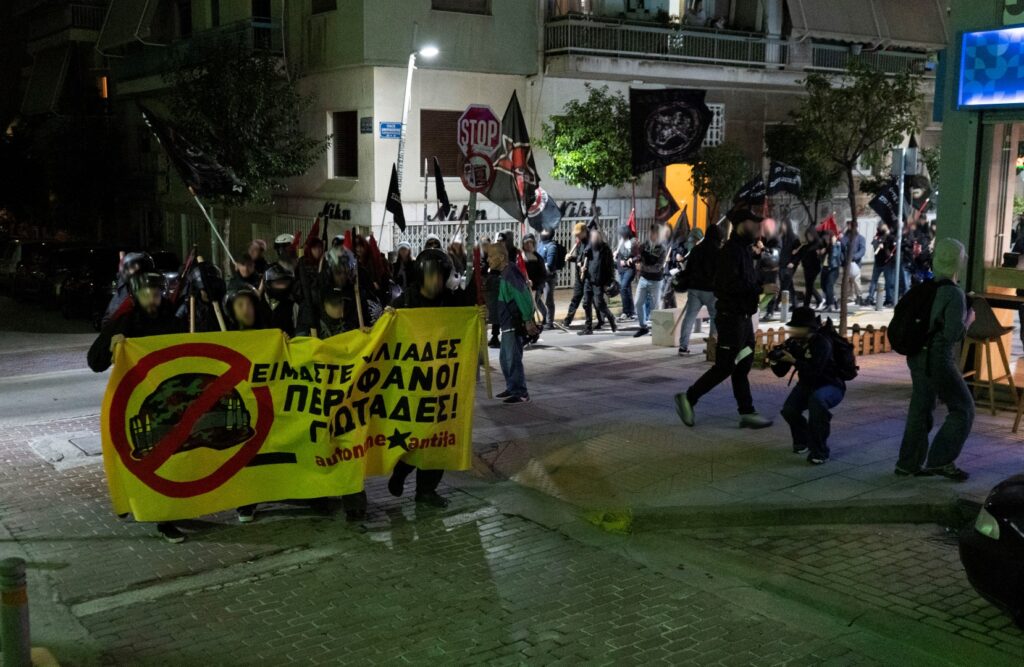 Μισή ωρίτσα αργότερα. Πάει και το χιλιόμετρο των μαγαζατόρων. Πάει και το ινκόγκνιτο. Μαζευόμαστε από το πουθενά. Από μαλάκες γινόμαστε διαδήλωση. Σημαίες. Κράνη. Αγκώνες σε αλυσίδες. Συνθήματα με θέμα το ιδιαιτέρως επίκαιρο υπουργείο πολέμου.