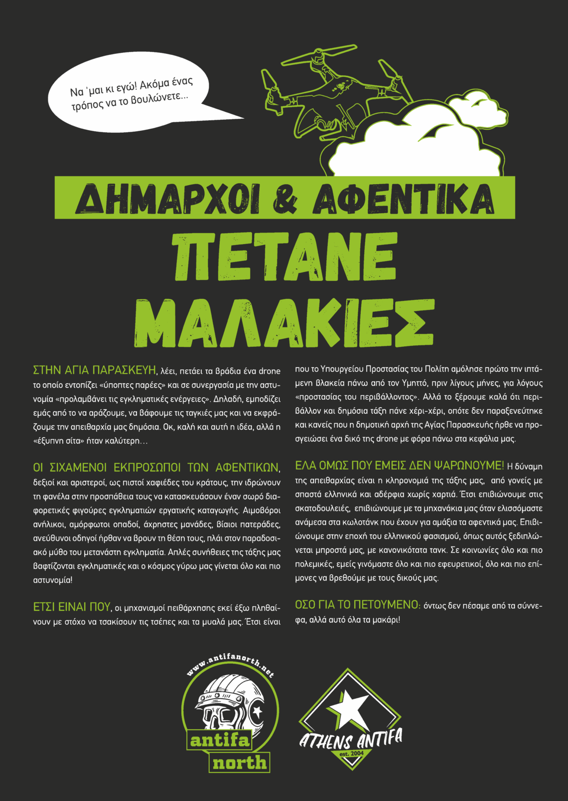 ΕΤΣΙ ΕΙΝΑΙ ΠΟΥ, οι μηχανισμοί πειθάρχησης εκεί έξω πληθαίνουν με στόχο να τσακίσουν τις τσέπες και τα μυαλά μας. Έτσι είναι που το Υπουργείου Προστασίας του Πολίτη αμόλησε πρώτο την ιπτάμενη βλακεία πάνω από τον Υμηττό, πριν λίγους μήνες, για λόγους «προστασίας του περιβάλλοντος». Αλλά το ξέρουμε καλά ότι περιβάλλον και δημόσια τάξη πάνε χέρι-χέρι, οπότε δεν παραξενεύτηκε και κανείς που η δημοτική αρχή της Αγίας Παρασκευής ήρθε να προσγειώσει ένα δικό της drone με φόρα πάνω στα κεφάλια μας.