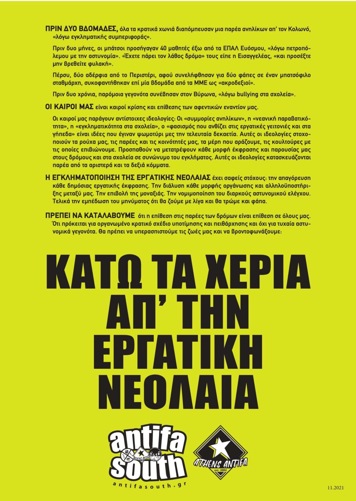 Η εγκληματοποίηση της εργατικής νεολαίας έχει σαφείς στόχους: την απαγόρευση κάθε δημόσιας εργατικής έκφρασης. Την διάλυση κάθε μορφής οργάνωσης και αλληλοϋποστήριξης μεταξύ μας. Την επιβολή της μοναξιάς. Την νομιμοποίηση του διαρκούς αστυνομικού ελέγχου. Τελικά την εμπέδωση του μηνύματος ότι θα ζούμε με λίγα και θα τρώμε και φάπα.