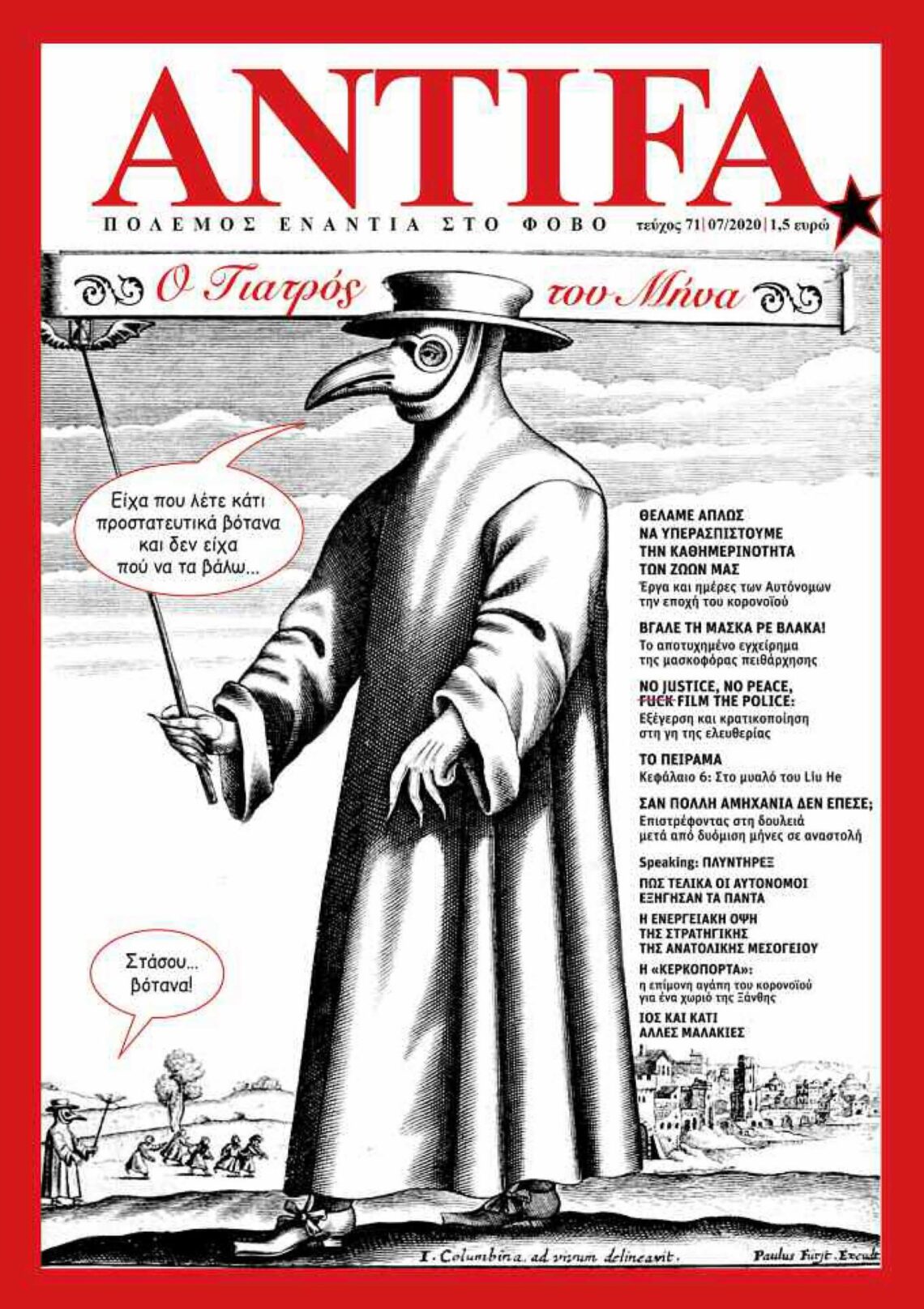 Οπότε τα μηνύματα στάλθηκαν, τους τεχνοσακατεμένους τους βρίσαμε, τη γνώμη μας για το χαρτί την εξηγήσαμε, η ήρα από το στάρι θα ξεχωρίσει μέσω περπατήματος στο περίπτερο, όλα κομπλέ. Απομένει να περιγράψουμε την ύλη. Λοιπόν, ετούτο το κακόφημο τεύχος Ιουλίου, αναλύει τους τρόπους ξεπλύματος της αριστεράς μετά την κατάφαση στη χούντα, αναδεικνύει το «κίνημα black lives matter» ως αυτό που είναι, εξιστορεί τρόπους επιβίωσης αυτόνομων στην καραντίνα, συνδέει ψηφοδέλτια επικρατείας της ΝΔ με κοιτάσματα πετρελαίου και μαθηματικά μοντέλα, εξισώνει βυζαντινούς ιστορικούς με σύγχρονους επιδημιολόγους, ψυχαναλύει τους μασκοφόρους συμπολίτες μας, σχολιάζει τη διπλωματική εργασία του υπουργού ψηφιακής μεταρρύθμισης στο MIT, και εξηγεί γιατί ο Σύριζα και οι ρουφιάνοι του δεν θα έπρεπε να έχουν κανένα πρόβλημα με το «νόμο για τις διαδηλώσεις».