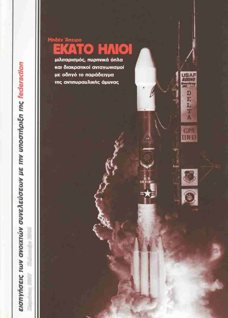Ήταν αρχές καλοκαιριού του 2008 κι οι αυτόνομοι εμφανίζονταν στο Γκίνη με την εκ πρώτης όψεως πιο ξεκούδουνη δημόσια εκδήλωση – στην ιστορία του Γκίνη ειδικά και των δημόσιων εκδηλώσεων εν γένει. Η εκδήλωση είχε τίτλο Εκατό Ήλιοι, θέμα την ιστορία, τη λειτουργία και το μέλλον της αντιπυραυλικής άμυνας και αφίσα καλέσματος με γραφιστικό εκτόξευση πυραύλου. Κάπου είχαμε διαβάσει ότι η φωτεινότητα μιας έκρηξης είναι εκατό φορές μεγαλύτερη από του ήλιου – εξού και ο τίτλος. Η εκδήλωση συνοδευόταν από σχετικά slides και μπόνους μια 70σέλιδη μπροσούρα, όπου η αυτόνομη ομάδα Μηδέν Άπειρο (οι διοργανωτές της εκδήλωσης) εξηγούσαμε τι είχαμε καταλάβει από την περιήγησή μας στις σχετικές τεχνολογίες των αφεντικών. Σαν διαρκές υπόστρωμα της εκδήλωσης, εμφανιζόταν με κάθε ευκαιρία η ανάγκη μας να πείσουμε, πρώτα τους εαυτούς μας και μετά όποιον άλλον είχαμε υπόψη, πως το θέμα ήταν σημαντικό. Ήδη από την εισαγωγή της μπροσούρας που συνόδευε την εκδήλωση μπορούσε κανείς να διαβάσει: