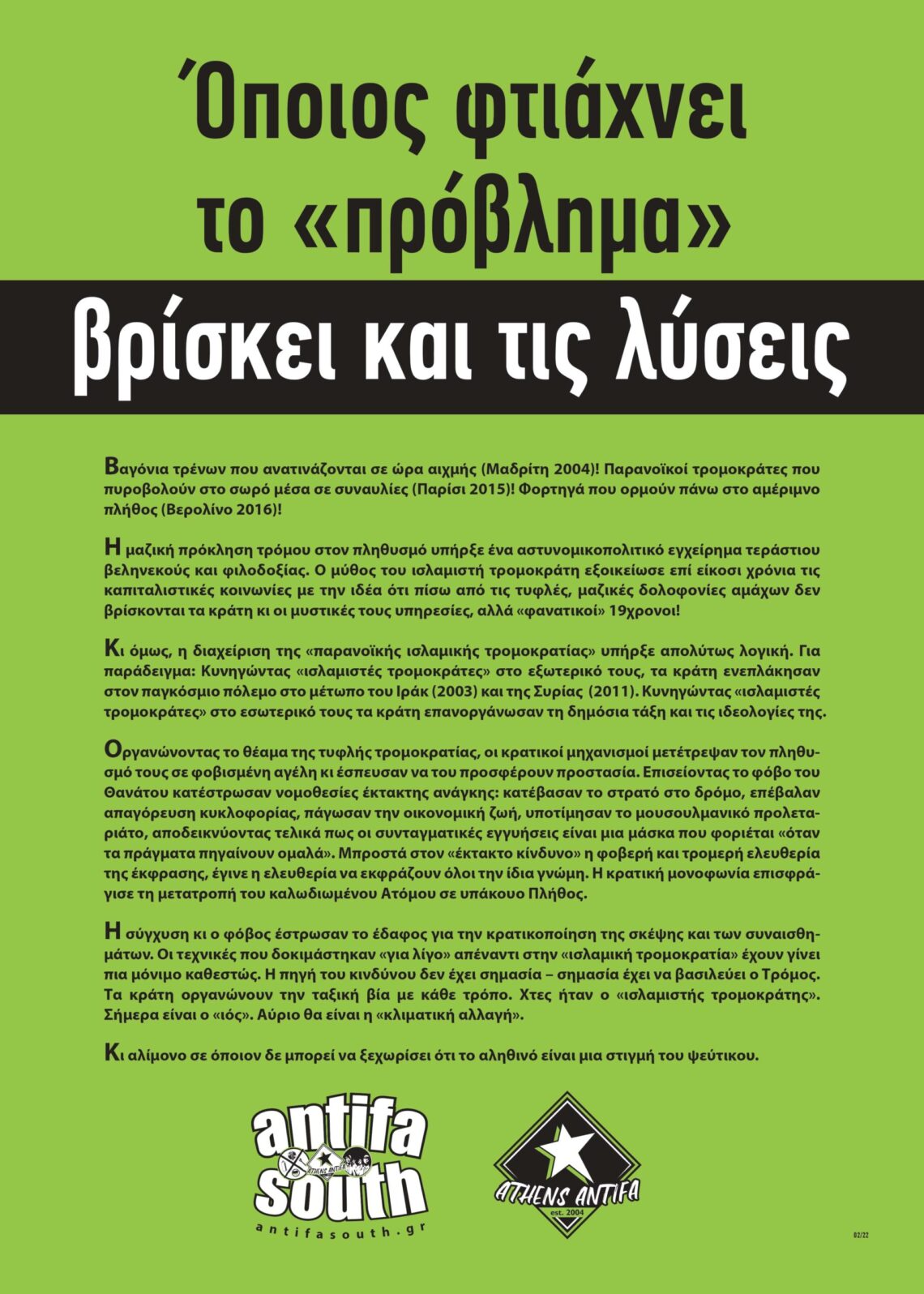 Η σύγχυση κι ο φόβος έστρωσαν το έδαφος για την κρατικοποίηση της σκέψης και των συναισθημάτων. Οι τεχνικές που δοκιμάστηκαν «για λίγο» απέναντι στην «ισλαμική τρομοκρατία» έχουν γίνει πια μόνιμο καθεστώς. Η πηγή του κινδύνου δεν έχει σημασία – σημασία έχει να βασιλεύει ο Τρόμος. Τα κράτη οργανώνουν την ταξική βία με κάθε τρόπο. Χτες ήταν ο «ισλαμιστής τρομοκράτης». Σήμερα είναι ο «ιός». Αύριο θα είναι η «κλιματική αλλαγή».