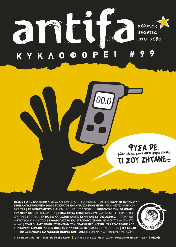 Σε καιρούς πολεμικής προετοιμασίας, τα drones, οι φρεγάτες και οι πύραυλοι αποτελούν προφανή σημάδια πολεμικής έξαψης των εθνών-κρατών. Το σακάτεμα των εγκεφαλικών κυττάρων μέσω social media, η διαχείριση της κυκλοφορίας, τα «μαζικά κινήματα» εθνικής ενότητας, η ακατάπαυστη υποτίμηση της αξίας των μεταναστών εργατών, η εντατικοποίηση της εργασίας με τεχνοφετιχιστικά μέσα, η διαρκής συσκότιση της ελληνικής εμπλοκής στο παγκόσμιο σφαγείο, οι τροχόμπατσοι και τα αλκοτέστ, αποτελούν ορισμένες μόνο αθέατες πλευρές πολέμου κάτω από τα χακί. Κι επειδή είναι αυτές που νιώθουμε όλο και περισσότερο στο πετσί μας μέρα με τη μέρα, μέσα από την ίδια την καθημερινότητά μας, επιλέγουμε να μιλήσουμε αφενός για πάρτη τους κι αφετέρου για τη δική μας οργάνωση απέναντί τους. Έτσι, το εξώφυλλο του καινούργιου τεύχους αυτήν την φορά δεν έχει Δένδια στυλ Τζον Ράμπο και Τομ Χανκς σε ρόλο λοχία, αλλά ένα εξίσου όχι και τόσο αθώο… αλκοτέστ 😊. Περιεχόμενα: